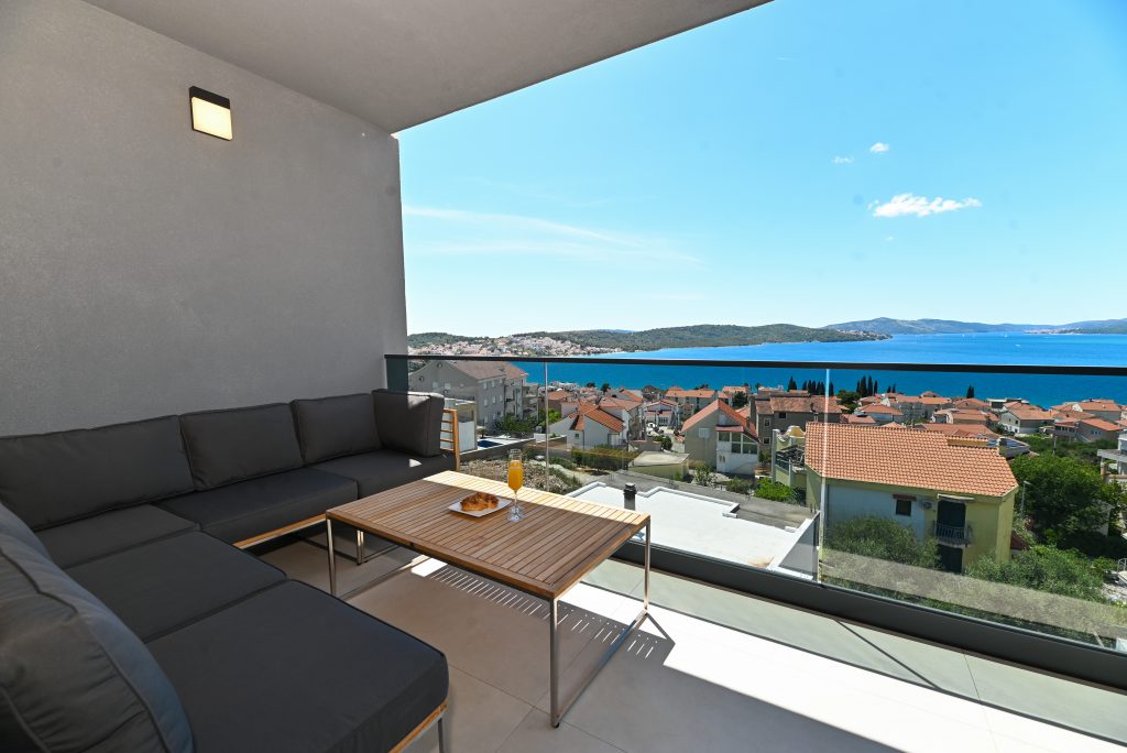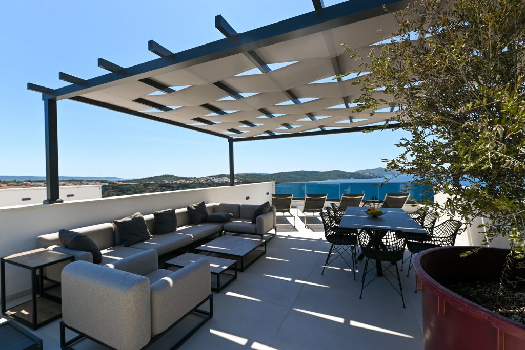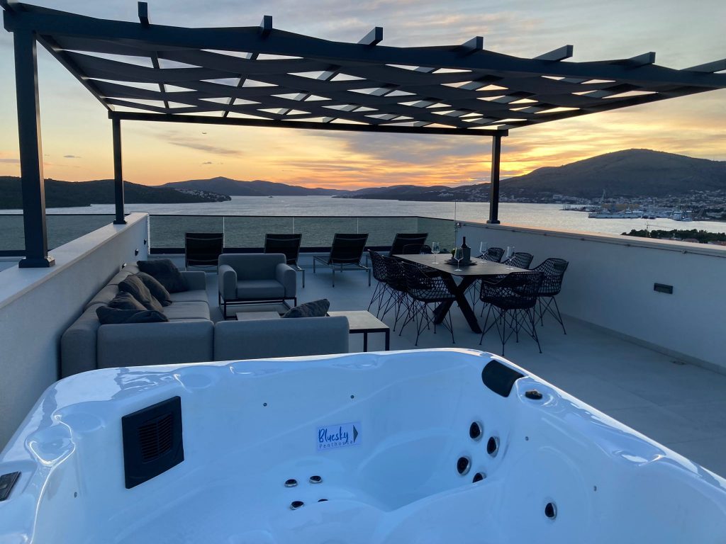 Willkommen im exquisiten Penthouse BlueSky, gelegen auf der idyllischen Insel Čiovo. Genießen Sie unvergleichliche Ausblicke auf das Meer von Ihrer großzügigen Terrasse und der atemberaubenden Dachterrasse.